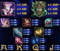 Although the Faerie Spells slot machine features a classic reel layout of 5×3, everything else in terms of features and function is quite modern. Take the symbols for example; first of all, two sets of them are used during different stages of the gameplay. The ones in the base game are – A, K, Q, J, Forest Spirits, Rose Staff, Crown, Dragonfly, Willow Tree, Brown Pixie, and Purple Faerie. There are three additional symbols that serve special functions – the Magic Toadstool, the Forest Ent, and the Faerie Queen.